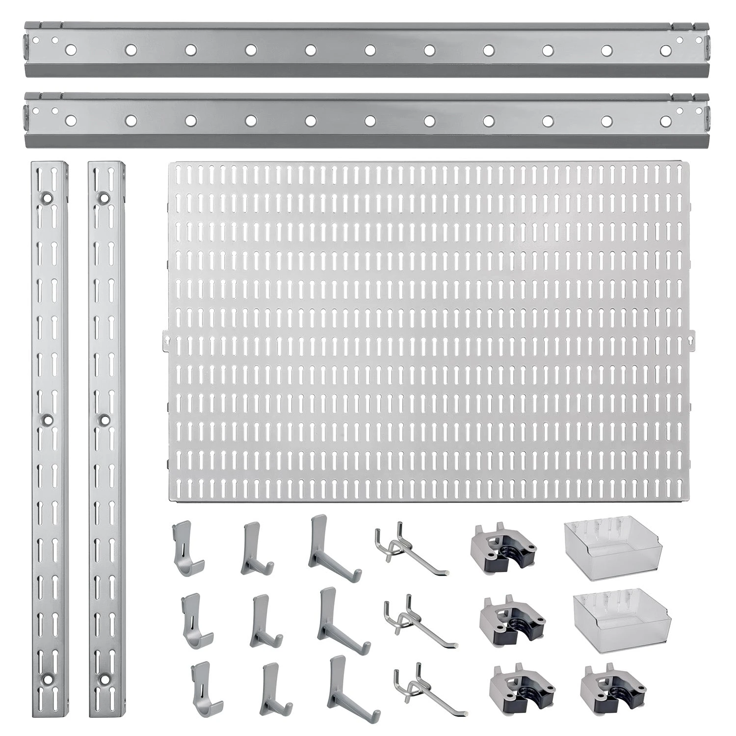 Set includes a 24 in. x 15 in. metal pegboard, two 24 inch utility rails, 2 vertical standards, 2 plastic parts bins, 12 assorted hooks and hangers and mounting hardware.