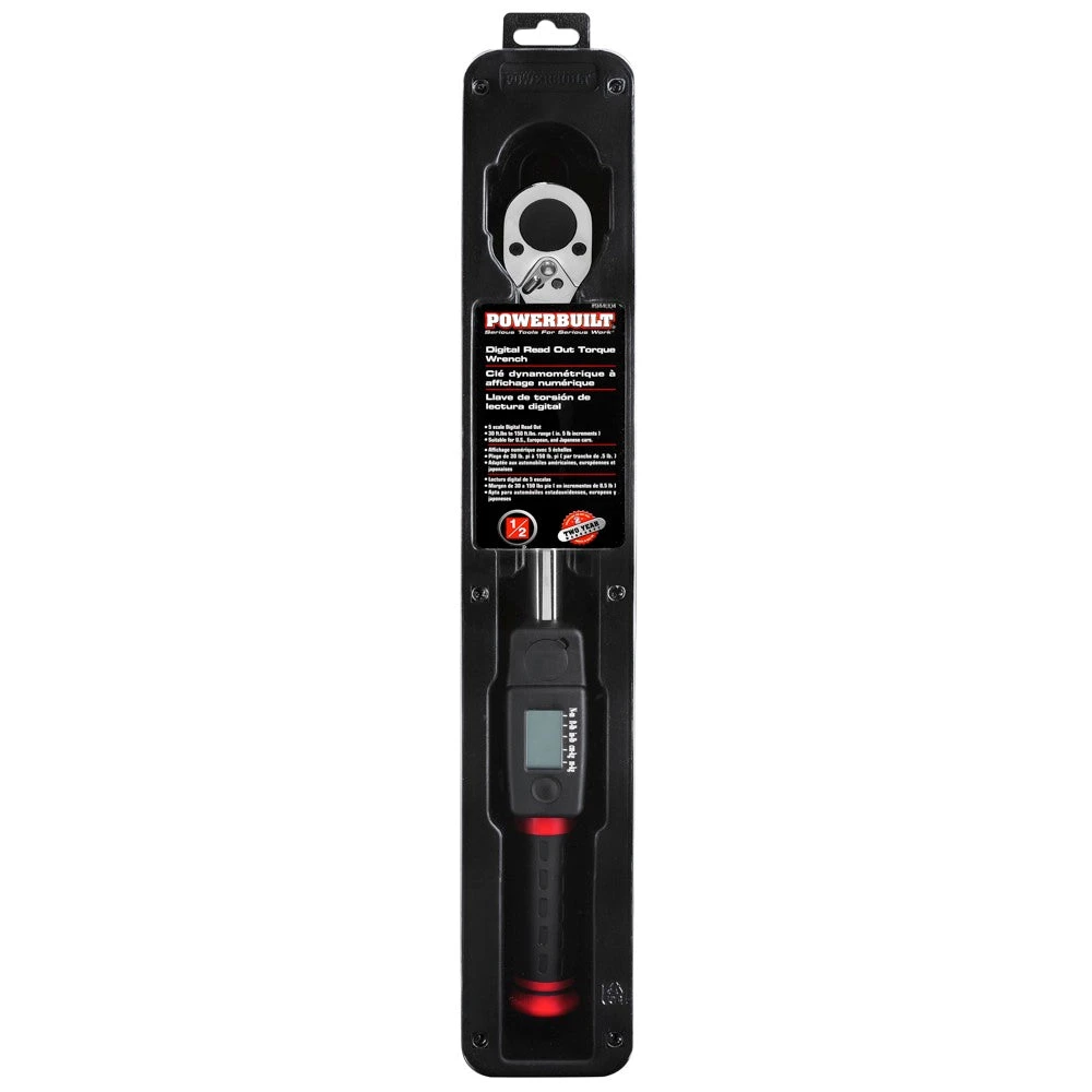 Digital technology makes the beefy, pro-quality Powerbuilt ½” drive torque wrench better, faster and more accurate. No more hard-to-read micrometer scale or guesstimate needles here – they’ve been replaced by a large easy-to-read digital readout. Simply set the units (foot pounds or one of the four other units settings) then turn the handle until the desired torque setting is displayed. Then lock the setting in and apply torque until the wrench clicks. It’s that simple and straightforward. The reversible ratchet mechanism makes tightening or loosening fasteners equally easy. Accurate to +/- 2%