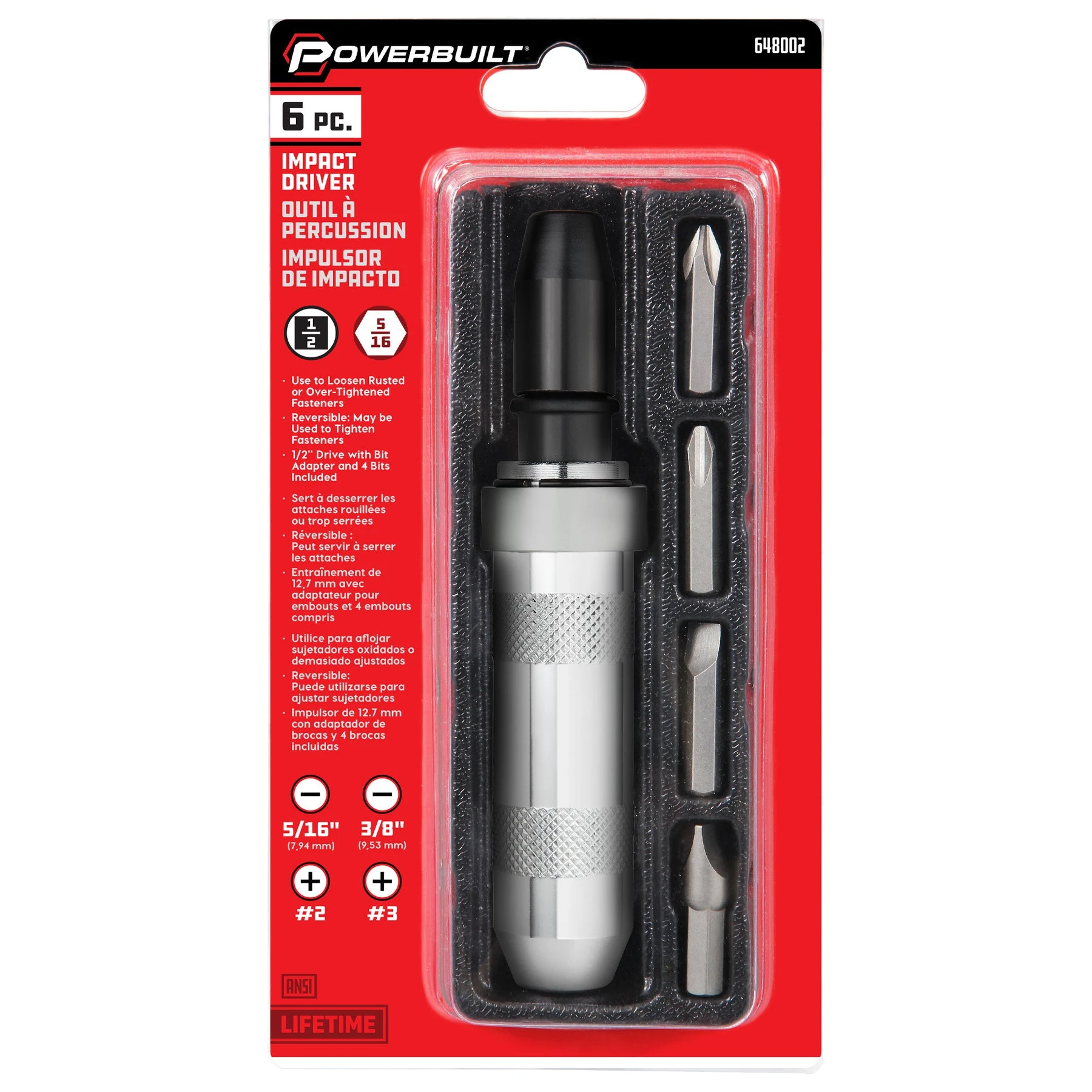 When you have frozen or rusted screws to break loose, there’s no substitute for an impact driver. Just load the appropriate slotted or Philips bit, place the driver on the screw, twist the driver, then strike it with a hammer. Simple and very effective! Precision-built and affordable, Perfect for handling Rotor retaining screws, Truck Bed bolts, and other stubborn fasteners. Powerbuilt products meet or exceed ANSI standards.