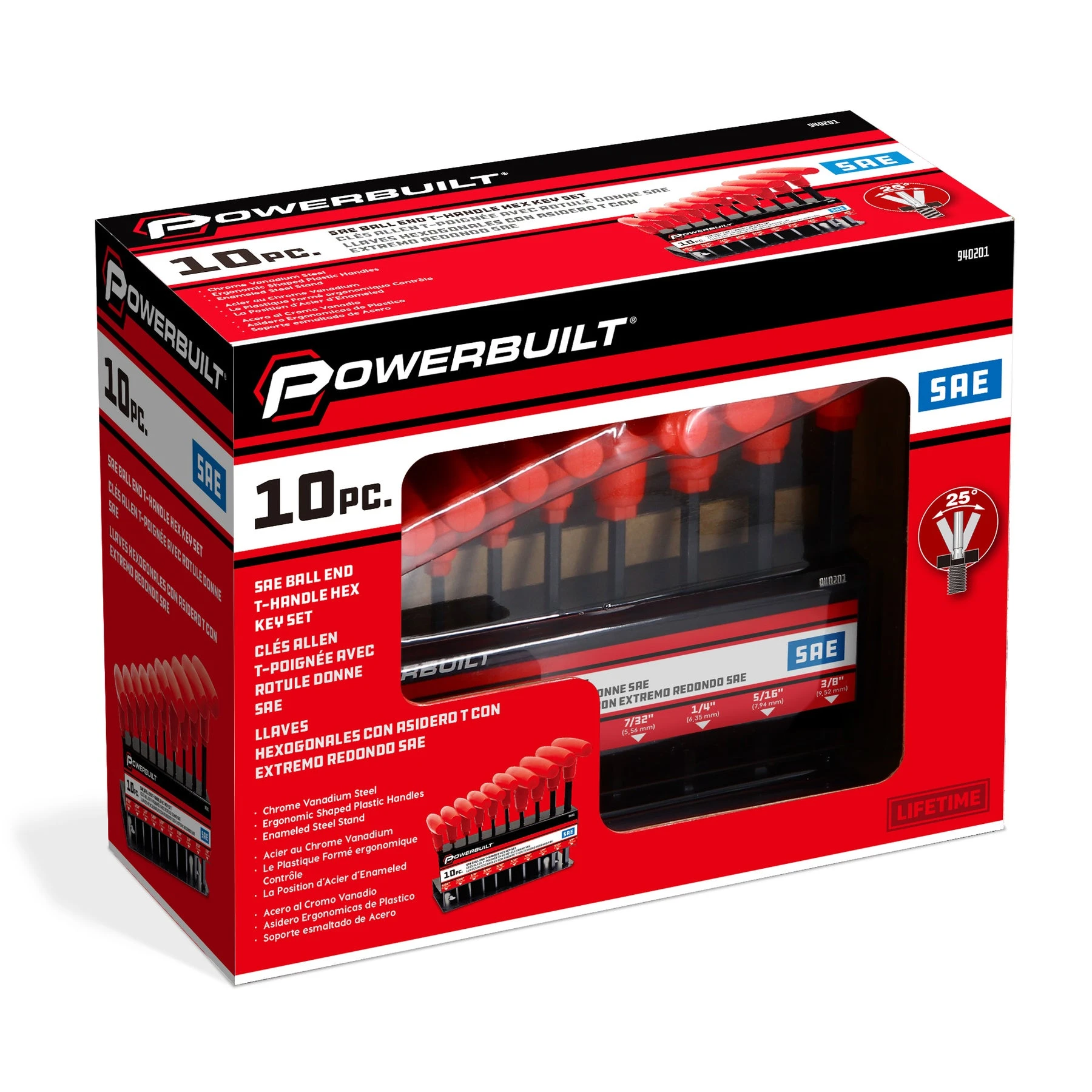The Powerbuilt 10 Piece SAE T-Handle Hex Key Wrench Set features ergonomic T-handles for comfort, speed, more torque, and durability with precise fit into SAE hex head fasteners. The hex key wrenches are constructed of premium chrome vanadium steel for durability and long tool life. For added versatility, each wrench features a ball end to allow turning hex fasteners from angles up to 25 degrees from vertical. Perfect for odd angles and tight spaces. Wrench set includes sizes 3/32 inch, 7/64 inch, 1/8 inch, 9/64 inch, 5/32 inch, 3/16 inch, 7/32 inch, 1/4 inch, 5/16 inch, and 3/8 inch. Keep the 10 hex key wrenches neatly organized in the included bench or wall mountable enameled steel holder. Wrench sizing is clearly labeled for quick access or inventory. Powerbuilt products meet or exceed ANSI standards. Dependable enough to last a lifetime.
