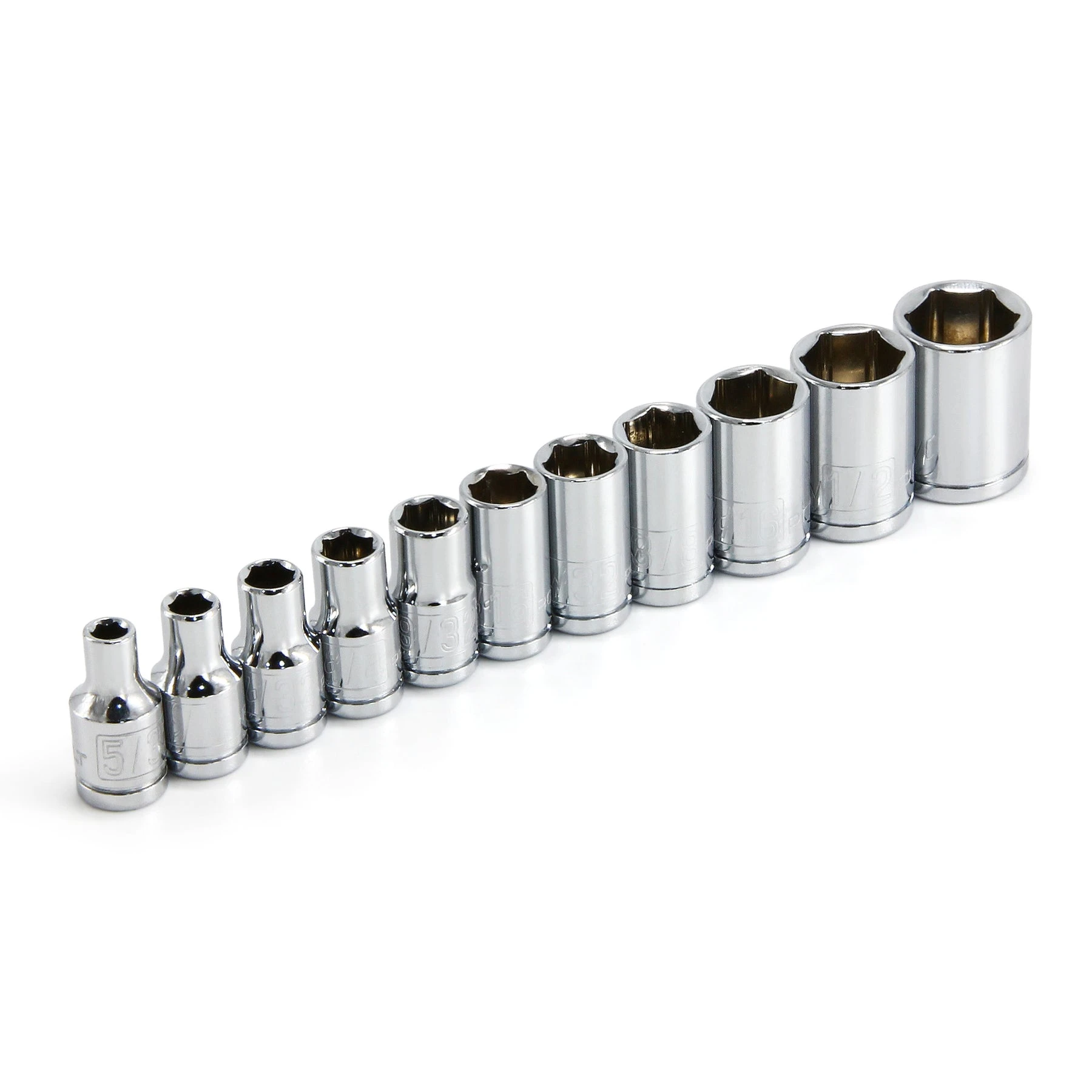 INCLUDES: 11 Piece 1/4 Inch Drive SAE 6 Point Sockets in sizes 5/32, 3/16, 7/32, 1/4, 9/32, 5/16,11/32, 3/8, 7/16, 1/2, 9/16 Inches