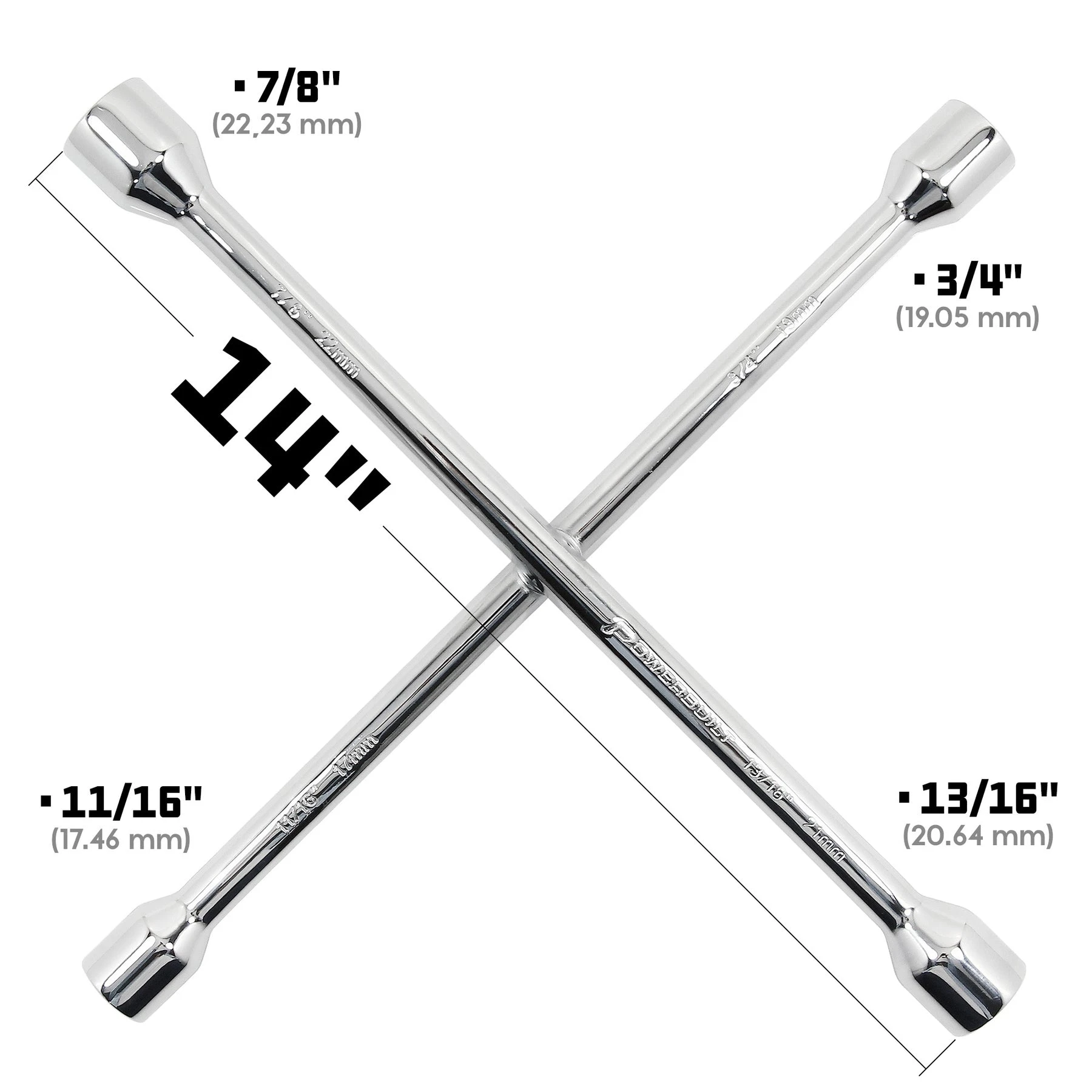 When you need a lug wrench it must be reliable. Few tools can match the strength, speed, and versatility of a Powerbuilt 4-Way Lug Wrench. This heavy-duty 14-inch lug wrench performs great and looks good too with its high chrome finish that helps resist corrosion. Universal design means it fits both SAE and metric lug nuts covering most vehicles. Precision-built and affordable, Powerbuilt products meet or exceed ANSI standards.