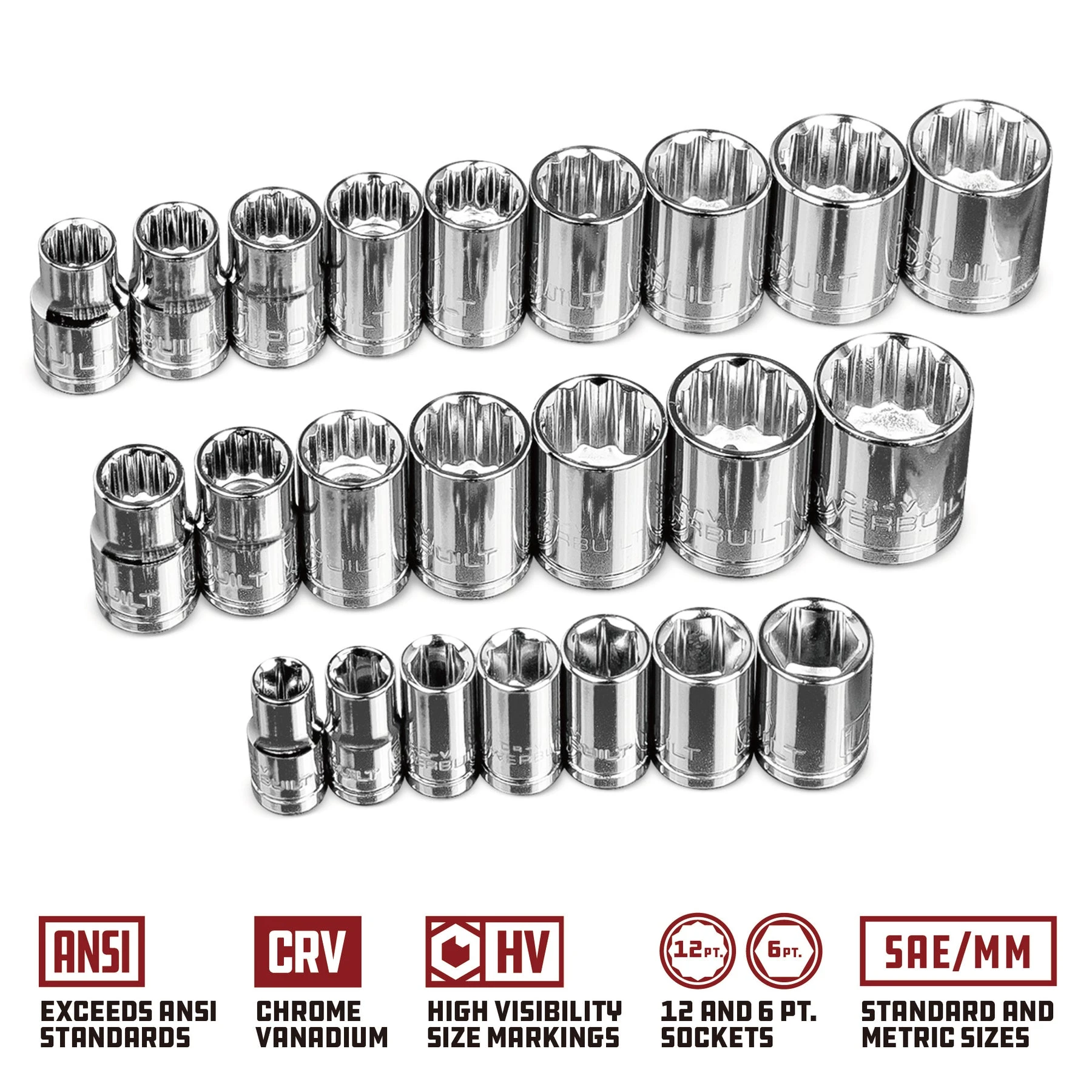 Perfect for the needs of both pros and serious home mechanics, this mirror-polished 26 piece SAE and metric chrome vanadium socket set has 1/4” drive and 3/8” drive sockets and tools in popular sizes.Strong as well as beautiful, the sockets feature jumbo high-visibility size markings that are forged right into each socket sidewall so they’ll never fade or wear off. But these sockets offer more than just stylish exteriors.Inside, our innovative Z-Drive design helps these sockets get a better grip on fasteners. They turn fasteners by their sides, not their corners, giving you more control and reducing slippage at high torque loads.Precision chamfered openings make it easier to slide the sockets over fasteners. Punched center holes add working space for taller nut and bolt stock.Dependable and affordable, Powerbuilt socket sets meet or exceed ANSI standards. Set Includes:1/4″ dr. 6 pt. SAE Sockets: 1/4”, 9/32”, 5/16”, 11/32”, 3/8”, 7/16”, 15/32”3/8″ dr. 12 pt. SAE sockets: 3/8″ thru 3/4″3/8″ dr. 6 pt. metric sockets: 9 thru 14mm, 16 thru 18mm3/8″ dr. ratchet3/8″ x 1/4″ socket adapterDurable Storage Case