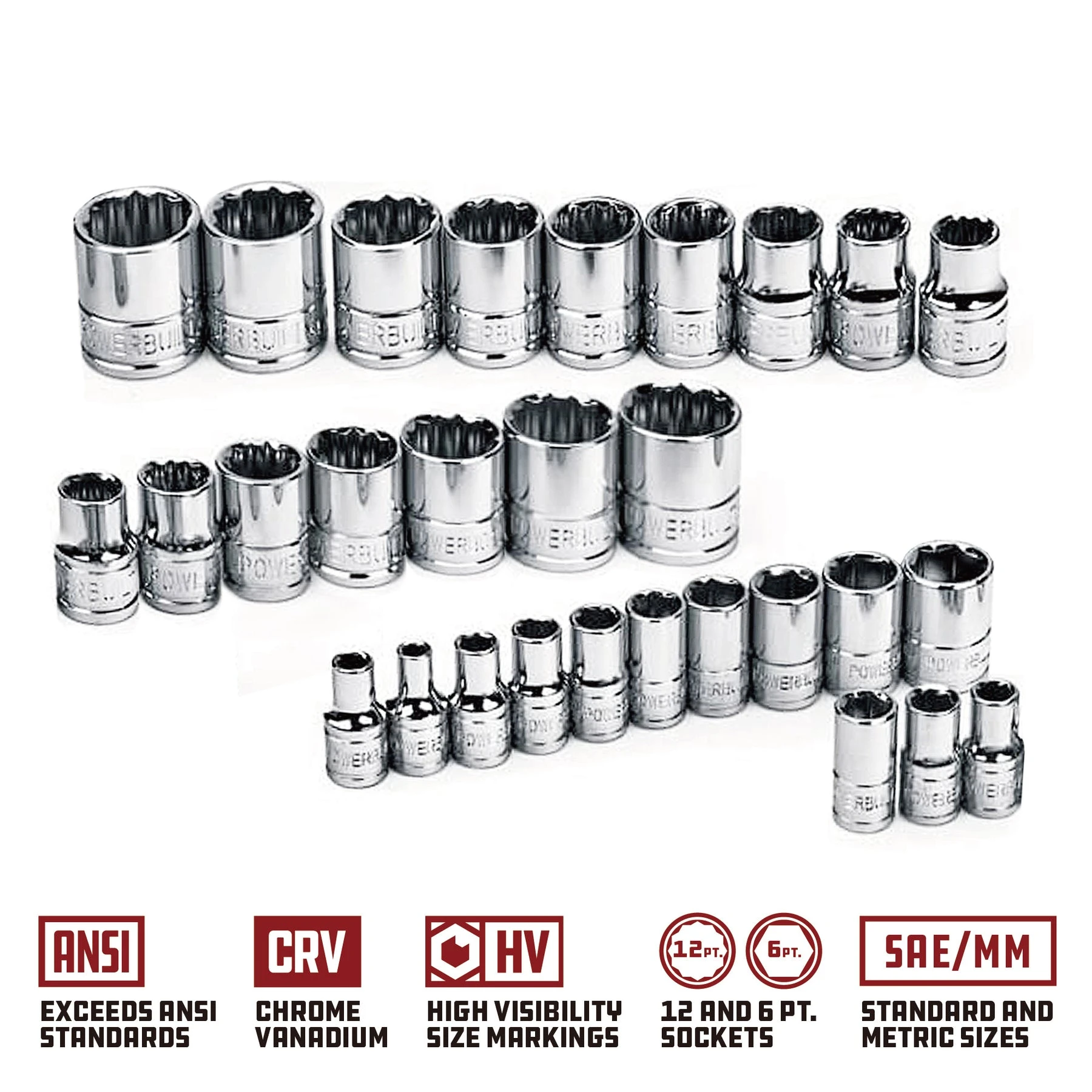 Perfect for the needs of both pros and serious home mechanics, this mirror-polished 33 piece SAE and metric Chrome Vvanadium socket set is strong as well as beautiful. The jumbo high-visibility size markings are forged right into each socket sidewall and will never fade or wear off. Also features our innovative Z-Drive design which helps these sockets get a better grip on fasteners giving more control and reducing slippage. Precision chamfered openings make it easier to slide the sockets over fasteners. Punched center holes add working space for taller nut and bolt stock.