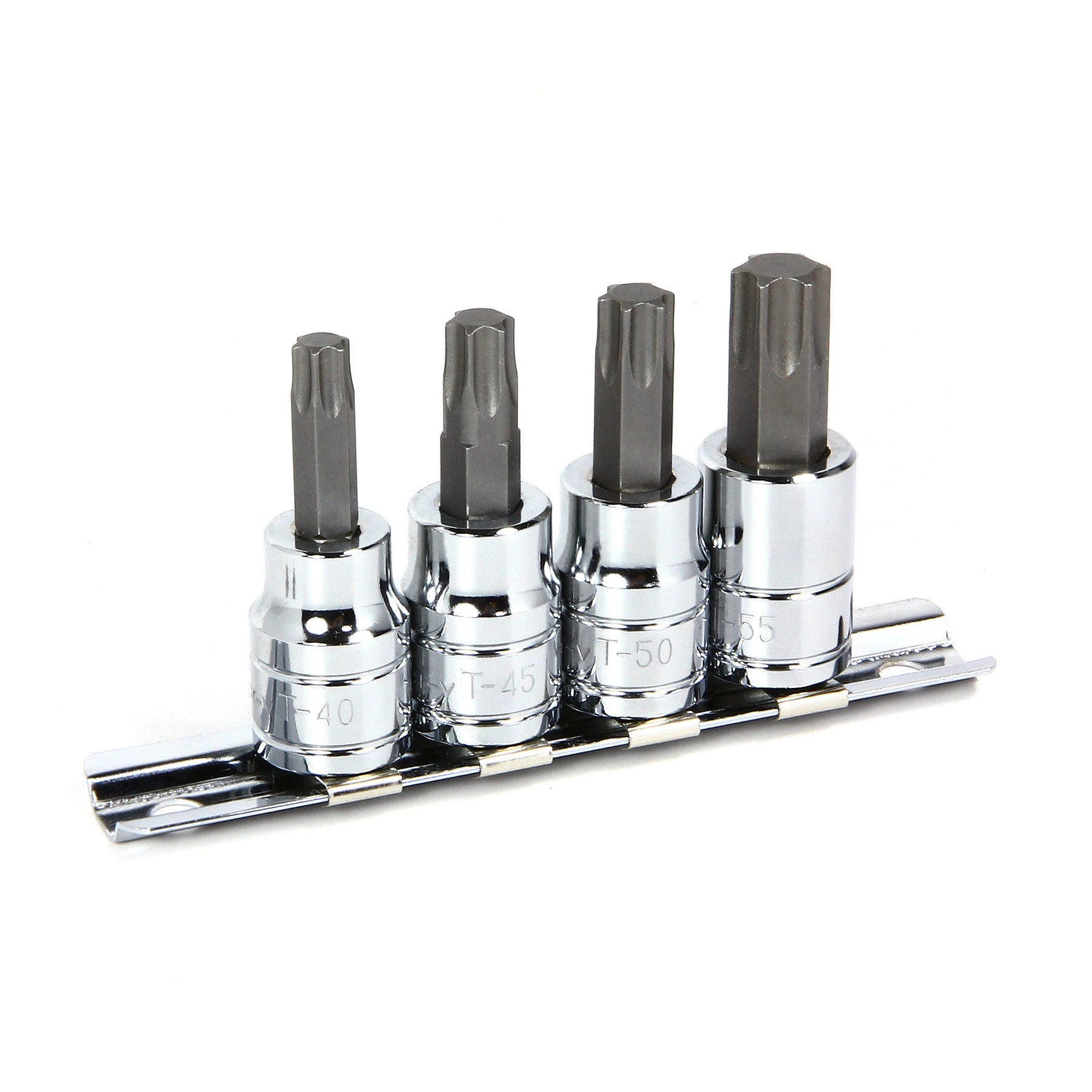 - 3/8-inch square drive sockets included: T-45, T-47, T-50, T-55 on a mini storage rail.