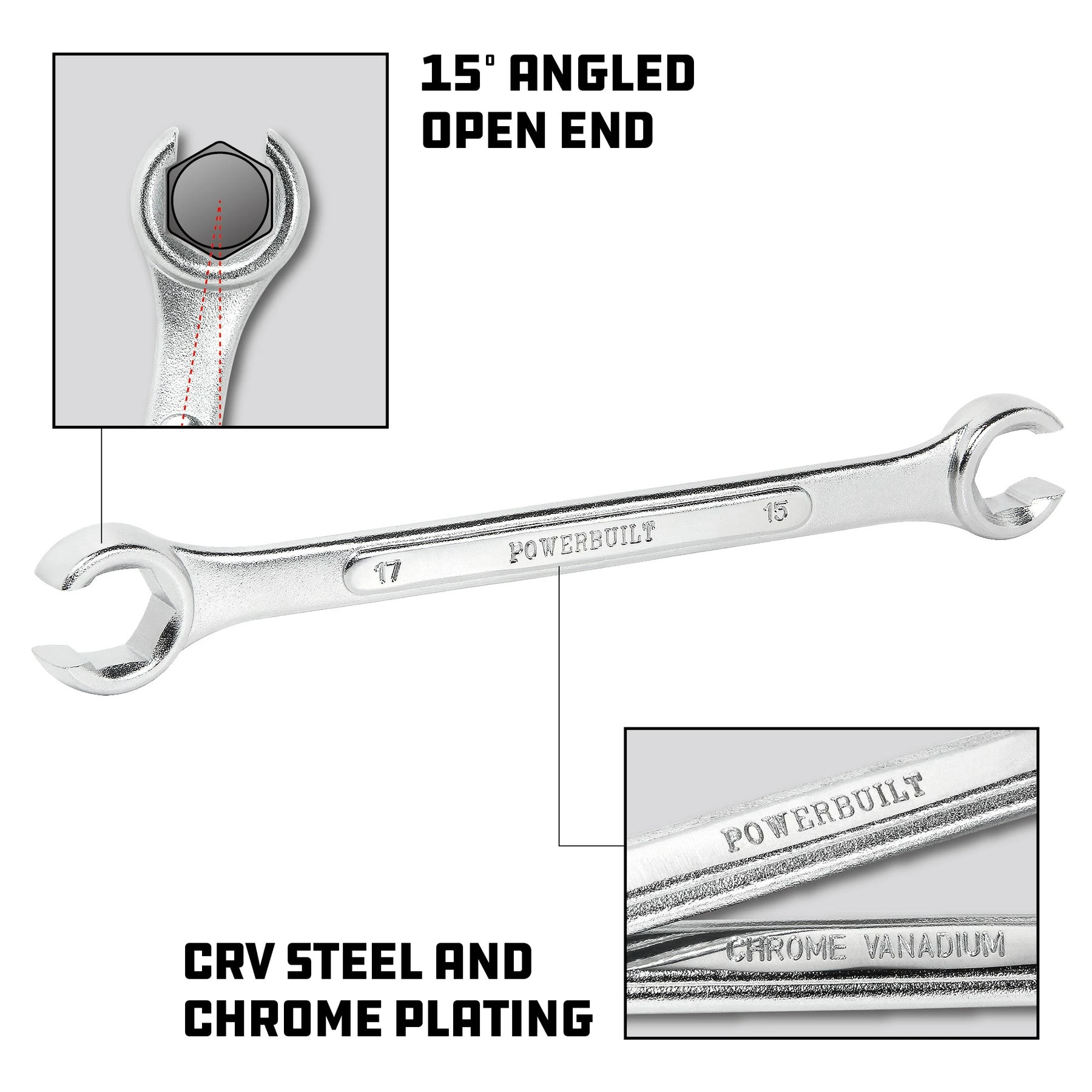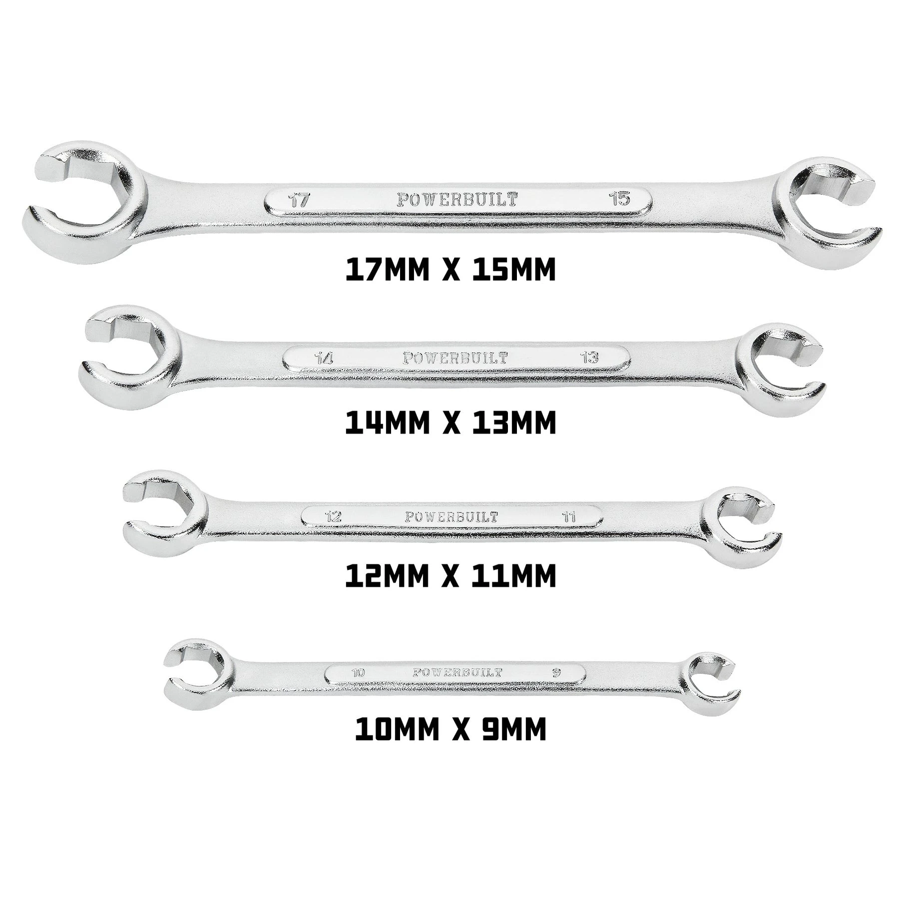 Powerbuilt Flare Nut Wrenches are made from Chrome Vanadium steel for added durability. The double open ends provide a 6 point connection for many common hose fittings, brass fittings and more. The flare nut design allows these wrenches to be used on hoses and tubing to easily side onto these types of fittings commonly found on automobile, HVAC and other similar applications. Perfect for automotive line fittings and plumbing applications.