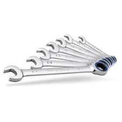 This 7 piece set offers a useful selection of Powerbuilt SAE ratcheting combination wrenches constructed from tough chrome vanadium steel that resists wear better than steel alone.These strong wrenches are mirror-polished to a smooth flawless finish, making these end wrenches almost too stylish to use. But use them you should, and with precision 72 tooth ratchet mechanisms you’ll get that repair or installation done that much faster.And the open ends feature beveled flats for easy mating to bolts and a 15 degree knuckle offset.So, consider these your new go-to SAE ratcheting combination wrenches.Precision built and affordable, Powerbuilt products meet or exceed ANSI standards.