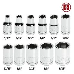INCLUDES: 1/2 Inch Drive SAE 6 Point Deep Sockets in sizes 1/2 , 9/16 , 5/8 , 11/16 , 3/4 , 13/16 , 7/8 , 15/16 Inch