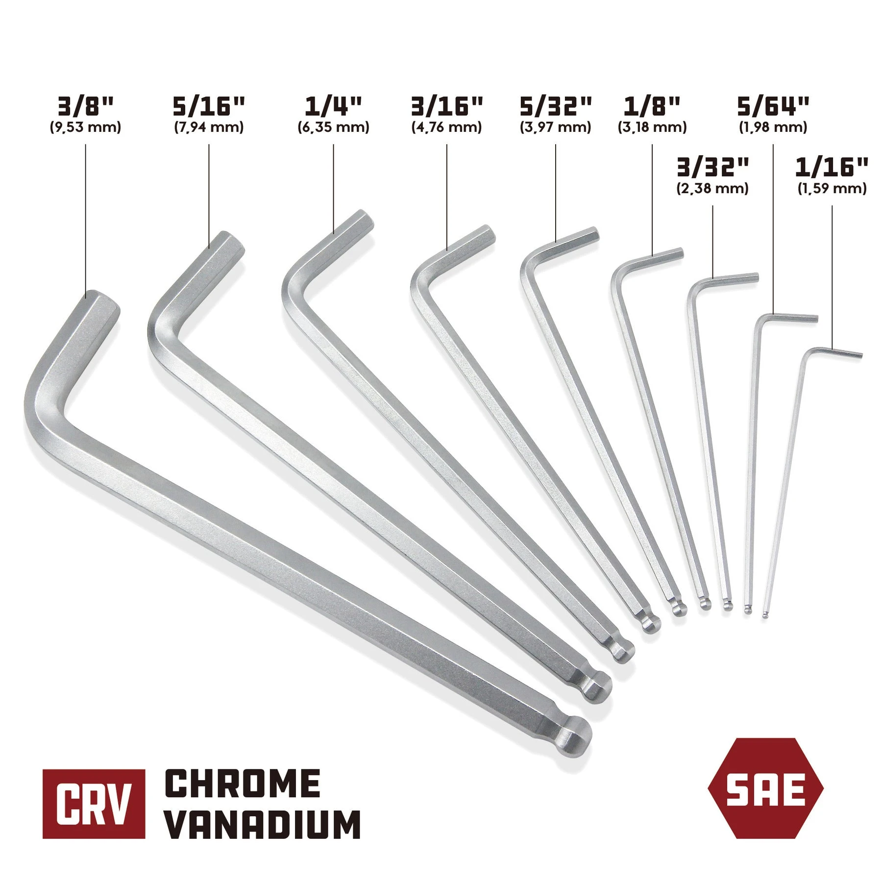 This top quality long arm SAE hex key wrench set offers strength, style and precision. Each wrench is constructed of premium chrome vanadium steel for durability and precise fit into hex head fasteners. 9 SAE hex key wrenches are tucked inside the included plastic carrier you can hang on pegboard or toss in a toolbox. For added versatility, each wrench features a ball end so you can grab and turn hex fasteners from angles up to 20 degrees from vertical. Stylish and affordable, Powerbuilt products meet or exceed ANSI standards. Dependable enough to last a lifetime.
