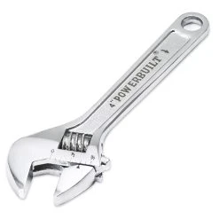 Powerbuilt adjustable wrenches are constructed from drop-forged chrome vanadium steel and fully polished to help prevent against corrosion. An extra-thick I-beam design offers greater comfort at high torque levels and the precision worm gear keeps jaws from loosening. In addition, the jaw is marked with an inch scale for easy bolt size identification.