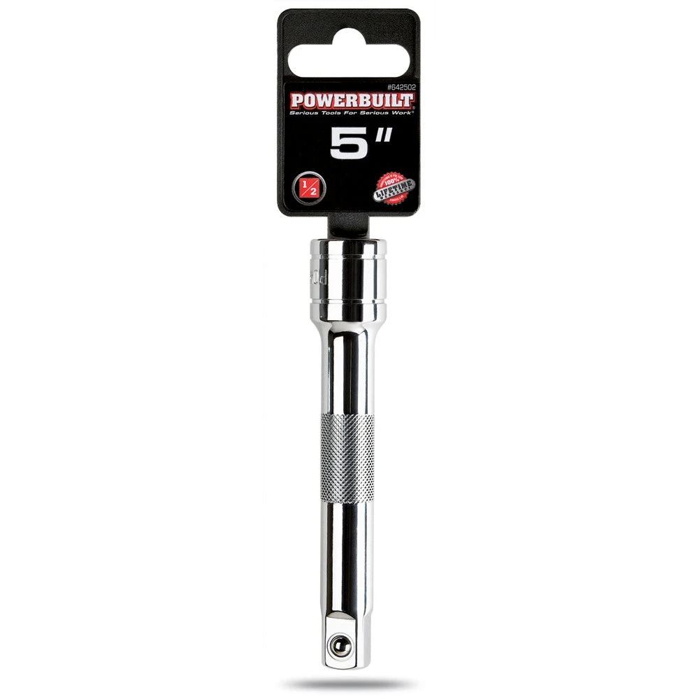 The Powerbuilt 1/2 Inch Drive 5 Inch Extension is the perfect socket extension. It’s made from high-quality Chrome Vanadium steel with a mirror polished chrome plated finish for durability and long tool life. Extensions are perfect solution tools for when accessing hard-to-reach places like when working in and around engines, under the chassis, or any other jobs that require a longer reach in a tight space. Each extension features knurling on the center of the shaft for a secure grip to allow for quicker rotation when tightening or loosening fasteners. No need to worry about dropping sockets into narrow spaces the Powerbuilt extensions also feature spring-loaded detent balls to help lock into and secure the sockets for worry-free retention.